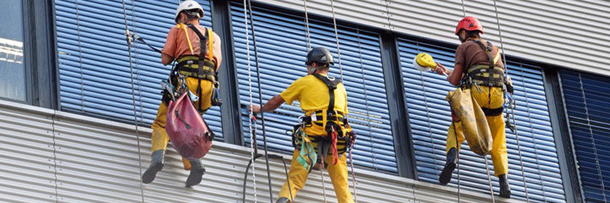 Наши альпинисты очищают отремонтированные фасады зданий и окна с помощью широкого спектра современных моющих средств.